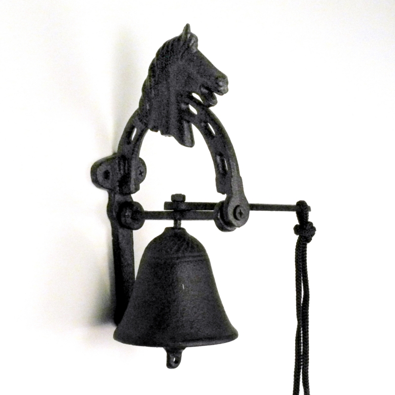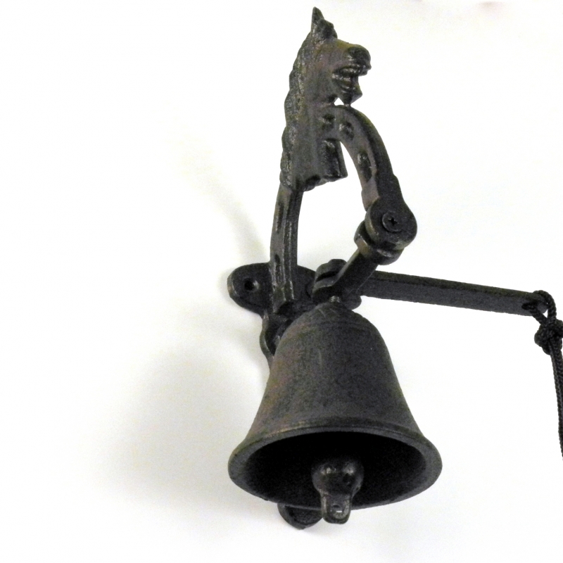 Celkové vnější rozměry: výška 20cm, hloubka od zdi 12cm, ramínko kyvadla pro zvonění 9cm. Zvonek o průměru 8cm.