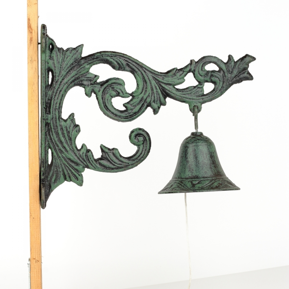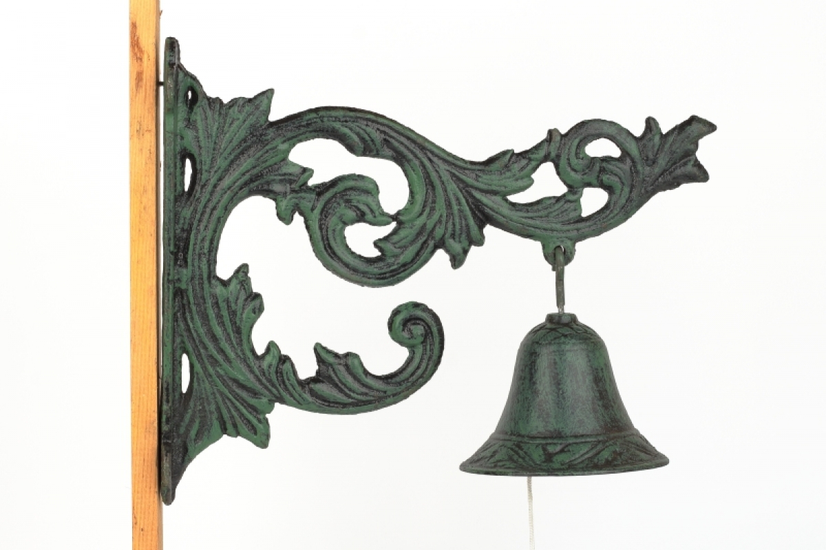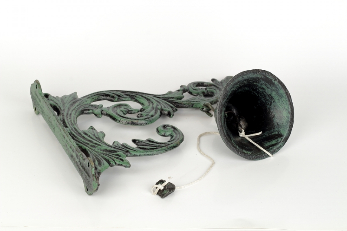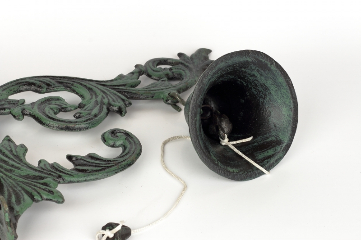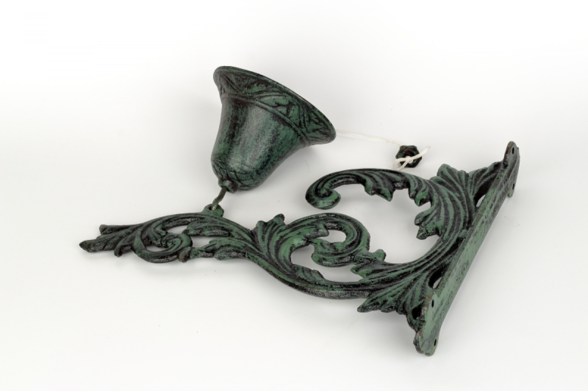 Samotný zelený litinový zvonek má průměr 11,5cm. Konzolka na zeď měří 25cm a vrchní rameno je dlouhé 30cm. Srdce zeleného zvonku je vyrobeno také z litiny.